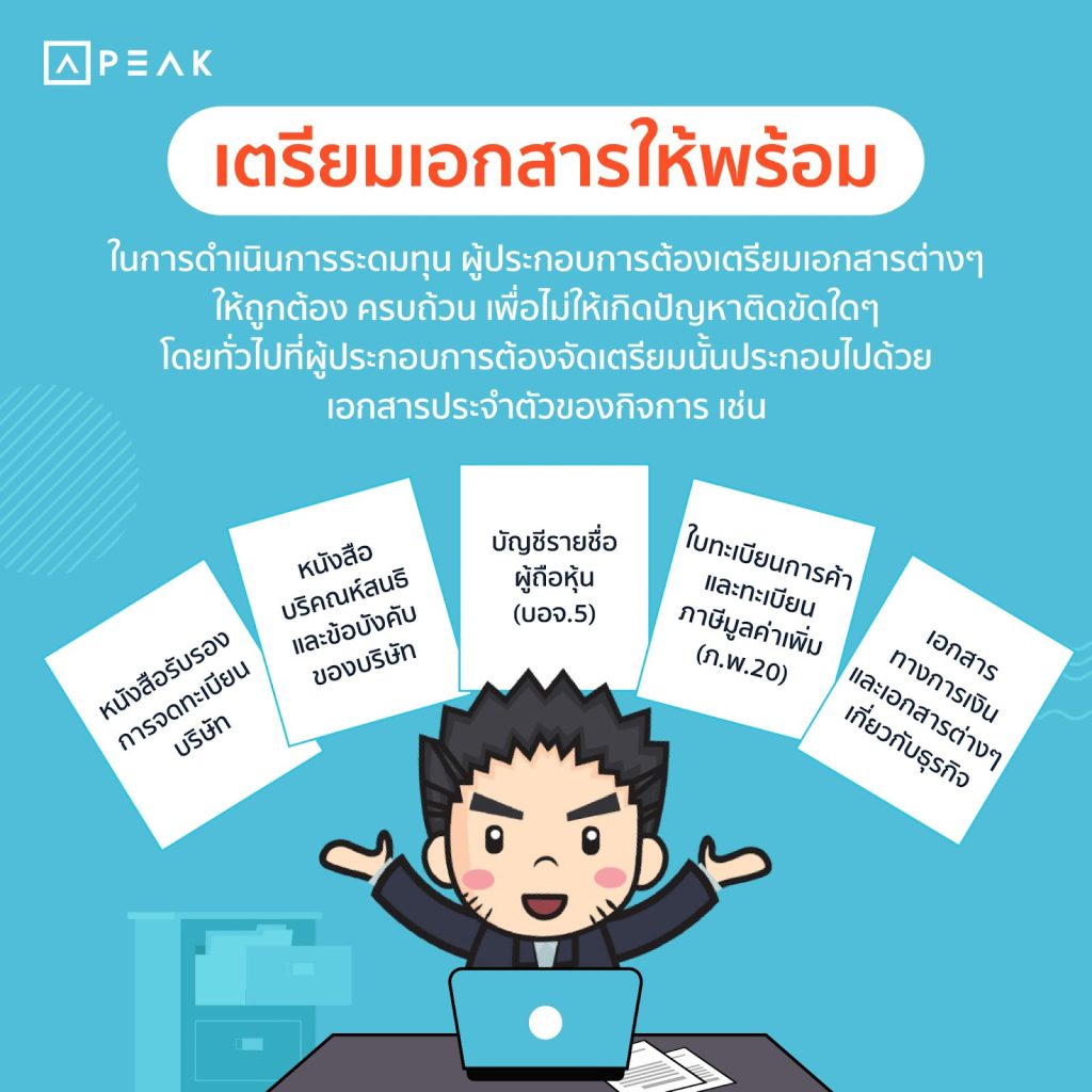 ในการดำเนินการระดมทุน ผู้ประกอบการต้องเตรียมเอกสารต่างๆ ให้ถูกต้อง ครบถ้วน เพื่อไม่ให้เกิดปัญหาติดขัดใดๆ โดยทั่วไปเอกสารที่ผู้ประกอบการต้องจัดเตรียมนั้นประกอบไปด้วย เอกสารประจำตัวของกิจการ เช่น หนังสือรับรองการจดทะเบียนบริษัท หนังสือบริคณห์สนธิและข้อบังคับของบริษัท บัญชีรายชื่อผู้ถือหุ้น (บอจ.5) ใบทะเบียนการค้าและทะเบียนภาษีมูลค่าเพิ่ม (ภ.พ.20) เอกสารทางการเงิน และเอกสารต่างๆ เกี่ยวกับธุรกิจ เป็นต้น