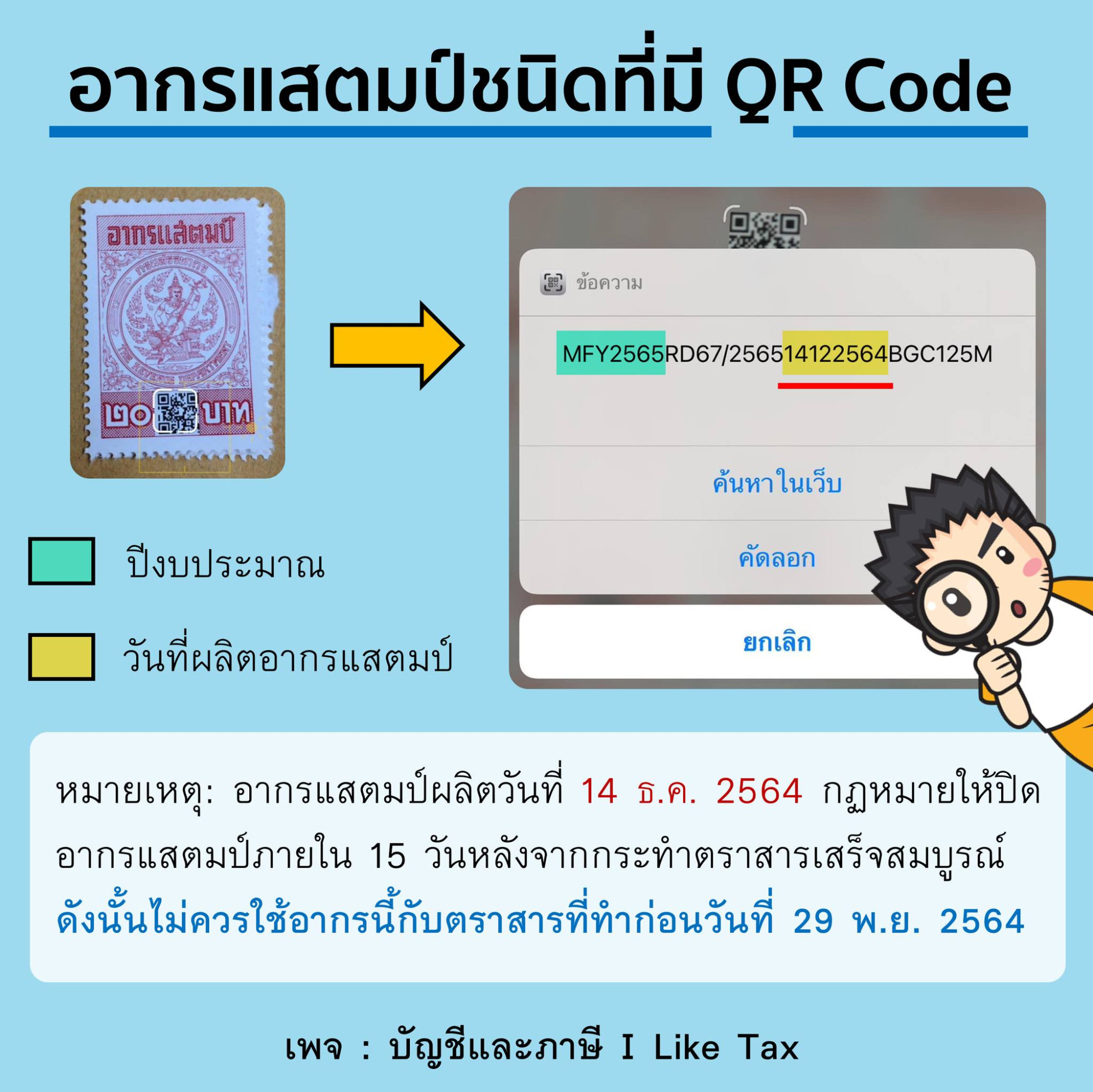 หลายท่านน่าจะคุ้นเคยกับอากรแสตมป์ที่มี QR Code เรียบร้อยแล้วเพราะใช้กันมาหลายปีแล้ว ซึ่ง QR Code ในอากรแสตมป์จะบอกวันที่ผลิตอากรแสตมป์นั่นเอง