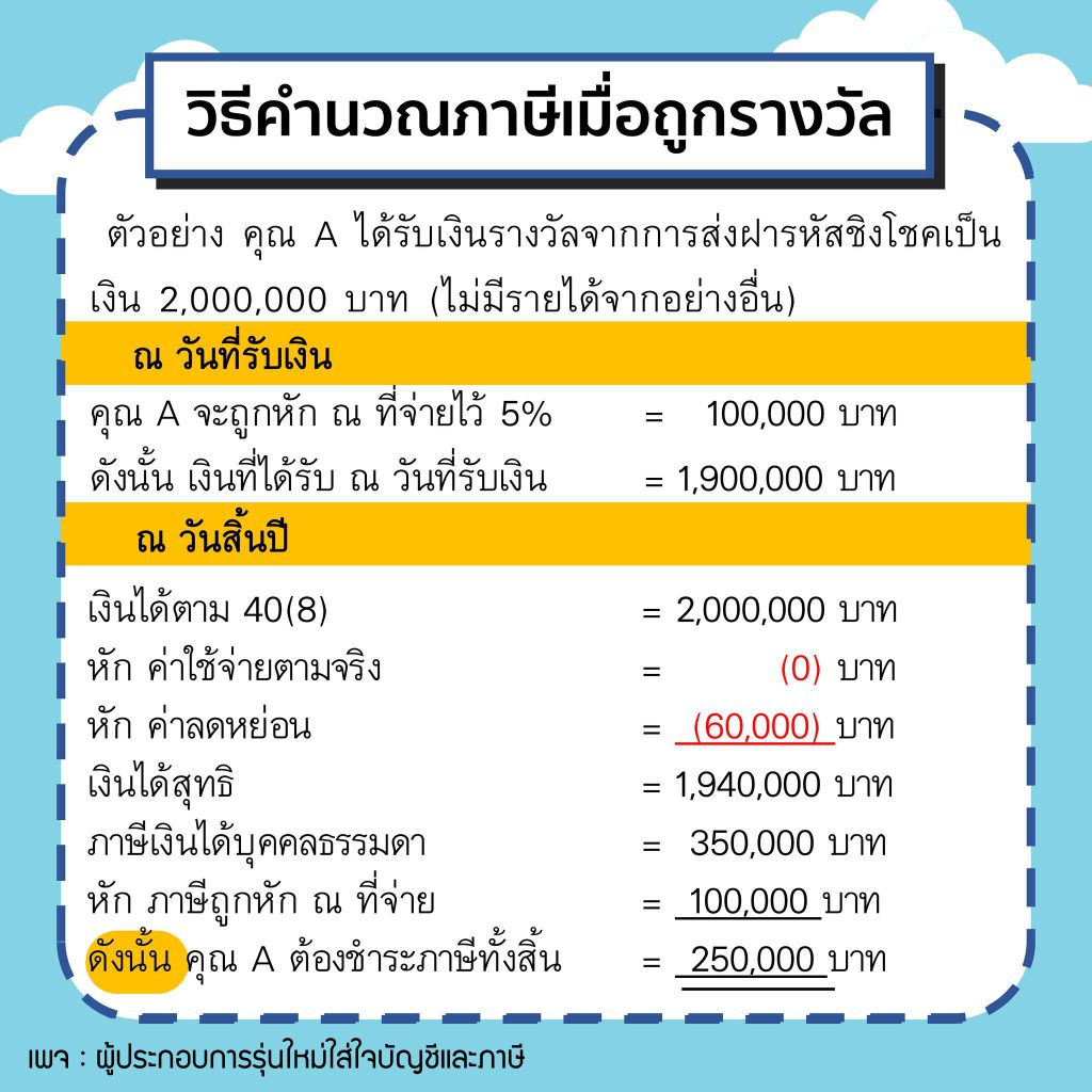 สรุป : ถ้าคุณถูกรางวัลชิงโชค อย่าลืมขอเอกสารหนังสือรับรองการหักภาษี ณ ที่จ่าย (50ทวิ) เก็บรวบรวมเอาไว้ใช้เป็นหลักฐานในการยื่นภาษีประจำปี และนำภาษีหัก ณ ที่จ่ายมาลดยอดภาษีที่จะต้องจ่ายประจำปี