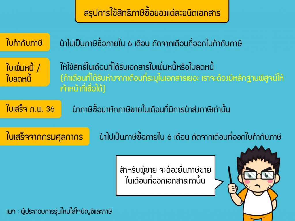 โดยสรุปได้ดังนี้ 1)ใบกำกับภาษี นำไปเป็นภาษีซื้อภายใน 6 เดือนที่ออกใบกำกับภาษี 2)ใบเพิ่มหนี้ ใบลดหนี้ ให้ใช้สิทธิ์ในเดือนที่ได้รับเอกสารใบเพิ่มหนี้หรือใบลดหนี้ 3)ใบเสร็จ ภ.พ.36 นำภาษีซื้อมาหักภาษีขยในเดือนที่มีการนำส่งภาษี 4)ใบเสร็จจากกรมศุลกากร นำไปเป็นภาษีซื้อภายใน 6 เดือน ถัดจากเดือนที่ออหใบกำกับภาษีครับ