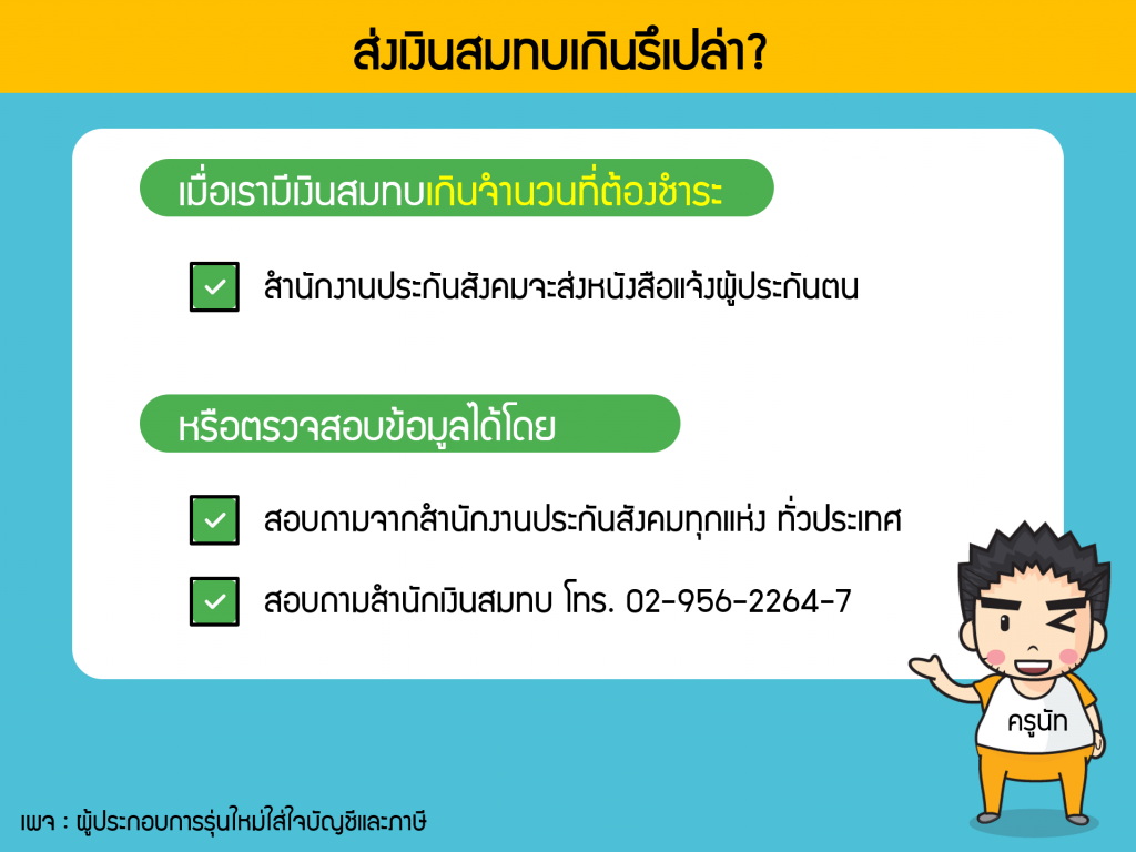จะรู้ได้ยังไงว่าเราส่งเงินสมทบเกินรึเปล่า ซึ่งนอกจากสำนักงานประกันสังคมจะเป็นผู้แจ้งเราแล้ว เรายังสามารถตรวจสอบได้เองโดยการสอบถามที่สำนักงานประกันสังคม และเมื่อรู้ว่าส่งเกินแล้วต้องการที่จะขอคืนเราก็จะต้องเตรียมเอกสารเพื่อขอคืนเงินสมทบ โดยจะส่งไปทางไปรษณีย์หรือนำส่งด้วยตนเองที่สำนักงานประกันสังคมก็ได้ครับ